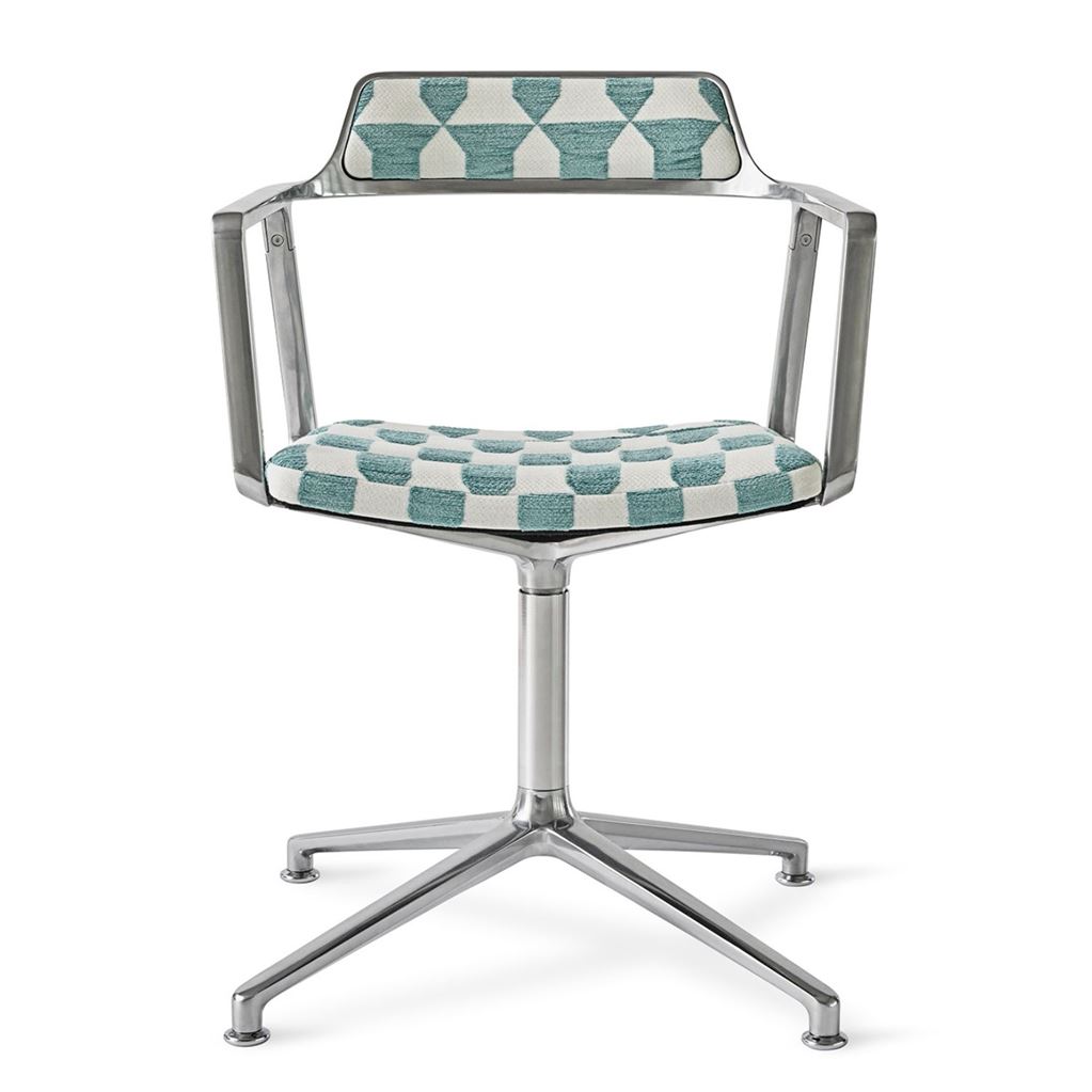 Denne specialudgave af Vipp Swivel-stolen er betrukket med et iøjnefaldende tofarvet møbelstof, inspireret af et middelalderligt våbenskjold. Stolen er designet til Vipp Townhouse i Lagrasse og trækker på historiske referencer. Mønsteret stammer oprindeligt fra det anerkendte franske tekstilhus Maison Le Manach og er blevet nyfortolket af Pierre Frey’s værksteder i det nordlige Frankrig.