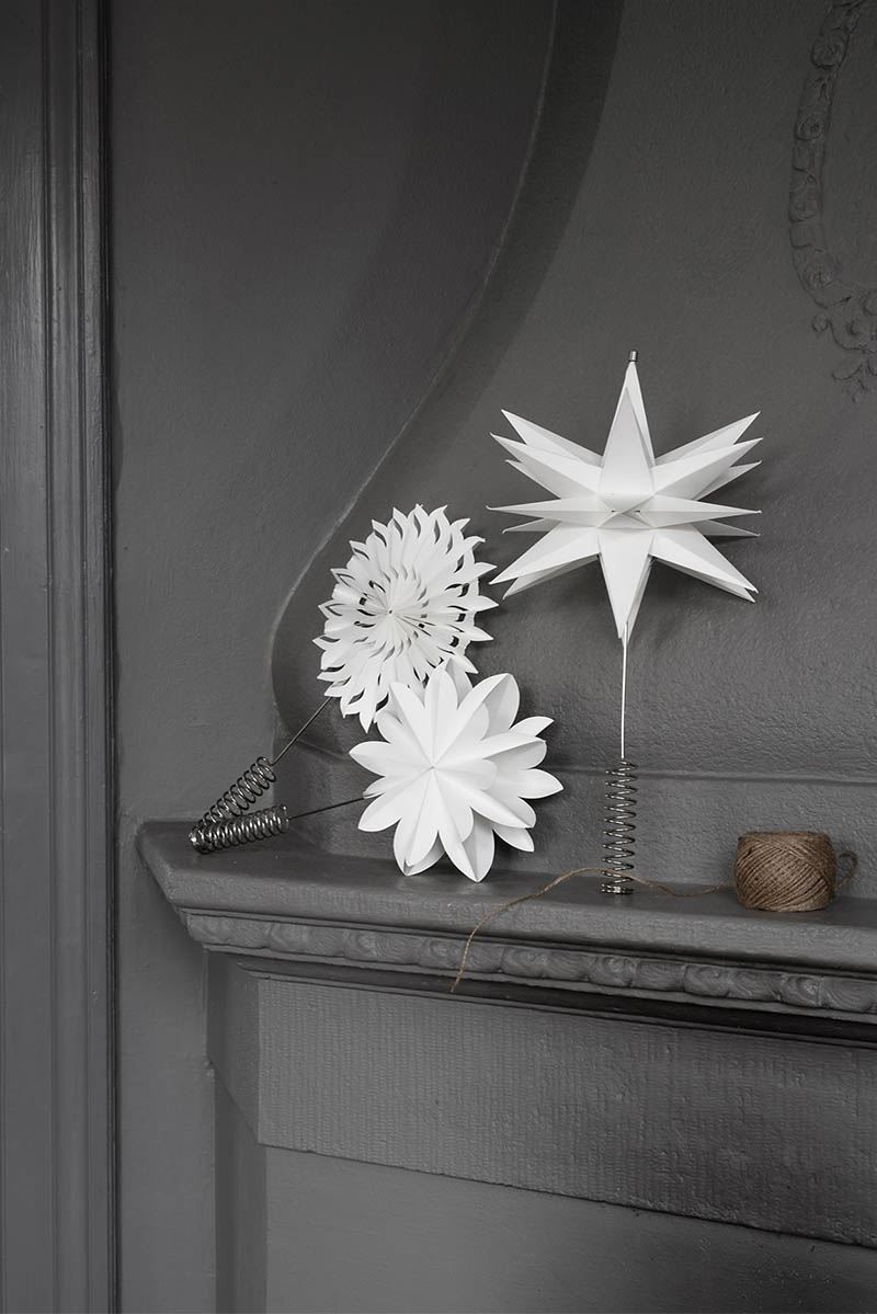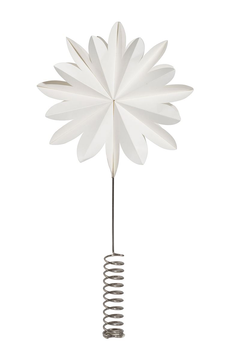 Denne smukke hvide topstjerne er et yndigt alternativ til den traditionelle guld topstjerne eller den hvide engel. Papirtopstjernen er faktisk ikke en stjerne, men en smuk cirkulær tredimensionel blomst. Hver del af topstjernen er foldet i hånden, hvilket gør den til helt unik.