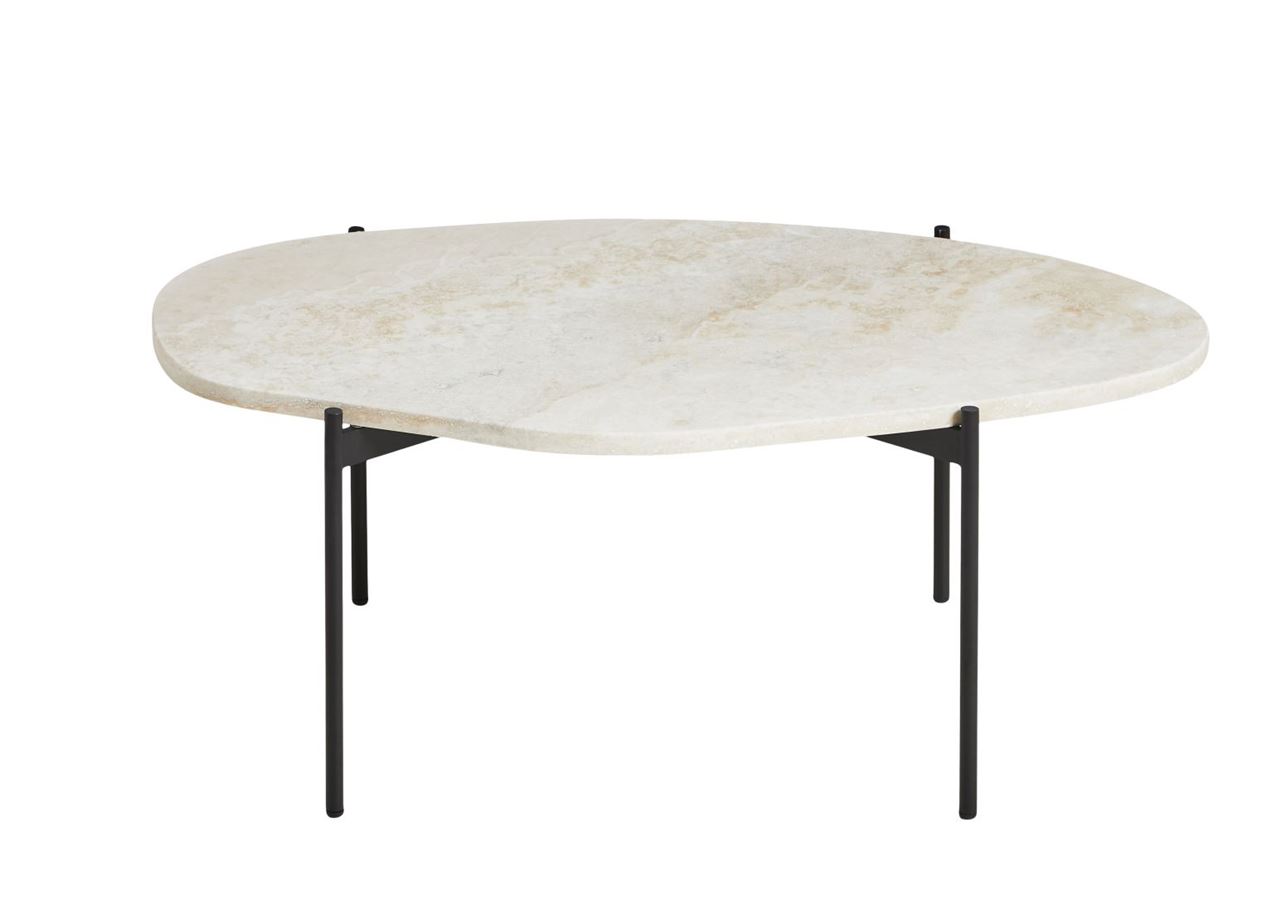 Sofistikeret og stilrent bord fra Woud. Inspireret af naturen, omfavner designet smukt de organiske former og dæmpede farver af bløde småsten i landskabet. De uendelige variationer af sten er reflekteret i de bløde, flydende former af bordpladen, som giver en subtil kontrast til de sorte metalben. Lavet af travertin, er hver overflade lige så unik som farvespillet er i det naturlige materiale. Herved bringes en lille del af naturen ind i hjemmet. Brug bordet i stuen eller
