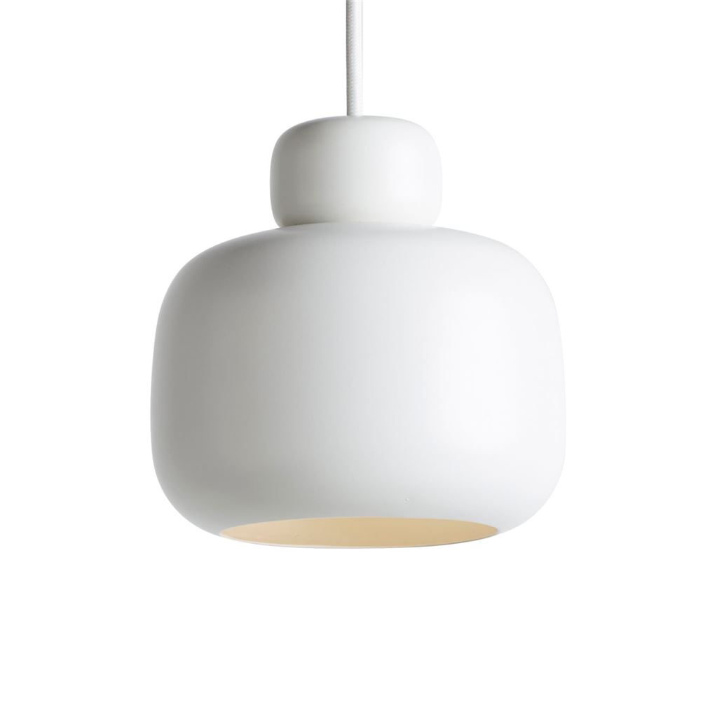 Lampen er fremstillet i malet metal og har en matchende stofbeklædt ledning. Stone fås i flere farver og størrelser, hvilket gør den ideel til alt fra køkkenøen og sofahjørnet til natbordet
