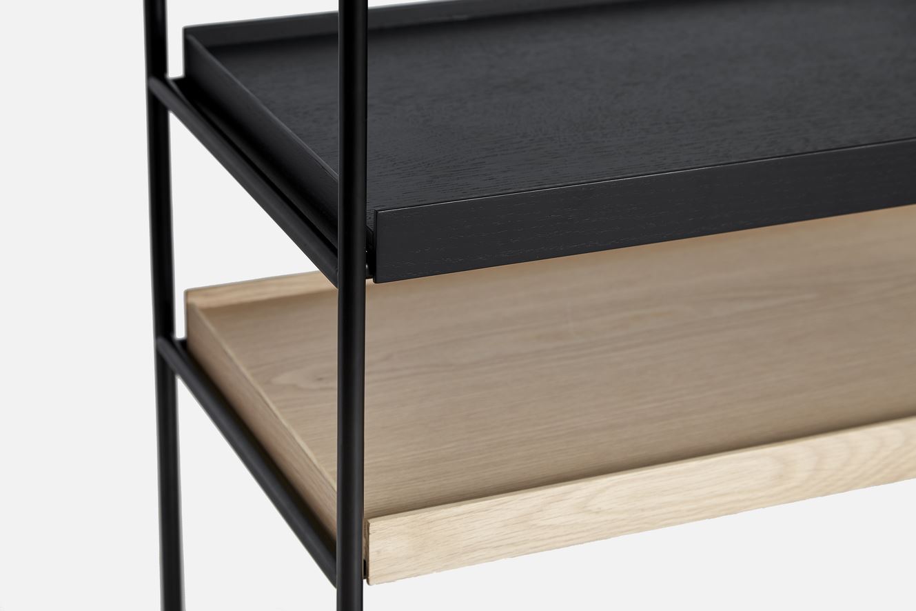 Tray Shelf fra WOUD er et reolsystem med lige linjer, æstetisk symmetri og har et simpelt udtryk. Reolen er designet til at skabe forskellige arrangementer af bakken, hvilket gør den dynamisk og personlig. Tag bakkerne og placér dem på de forskellige niveauer, som du lyster.